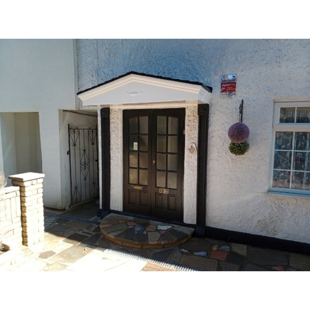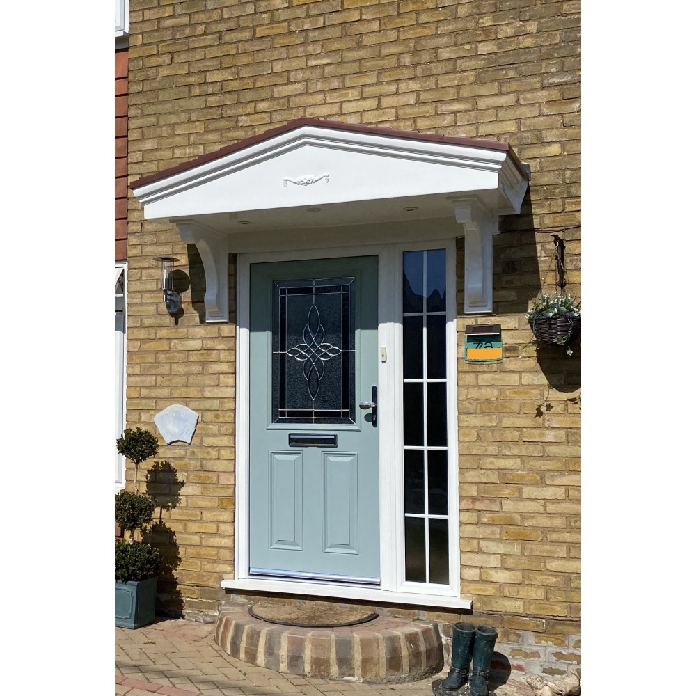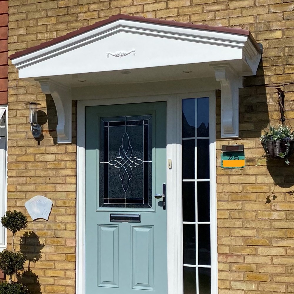 GRP fibreglass door canopy is moulded with a dual pitch tiled roof, integral
